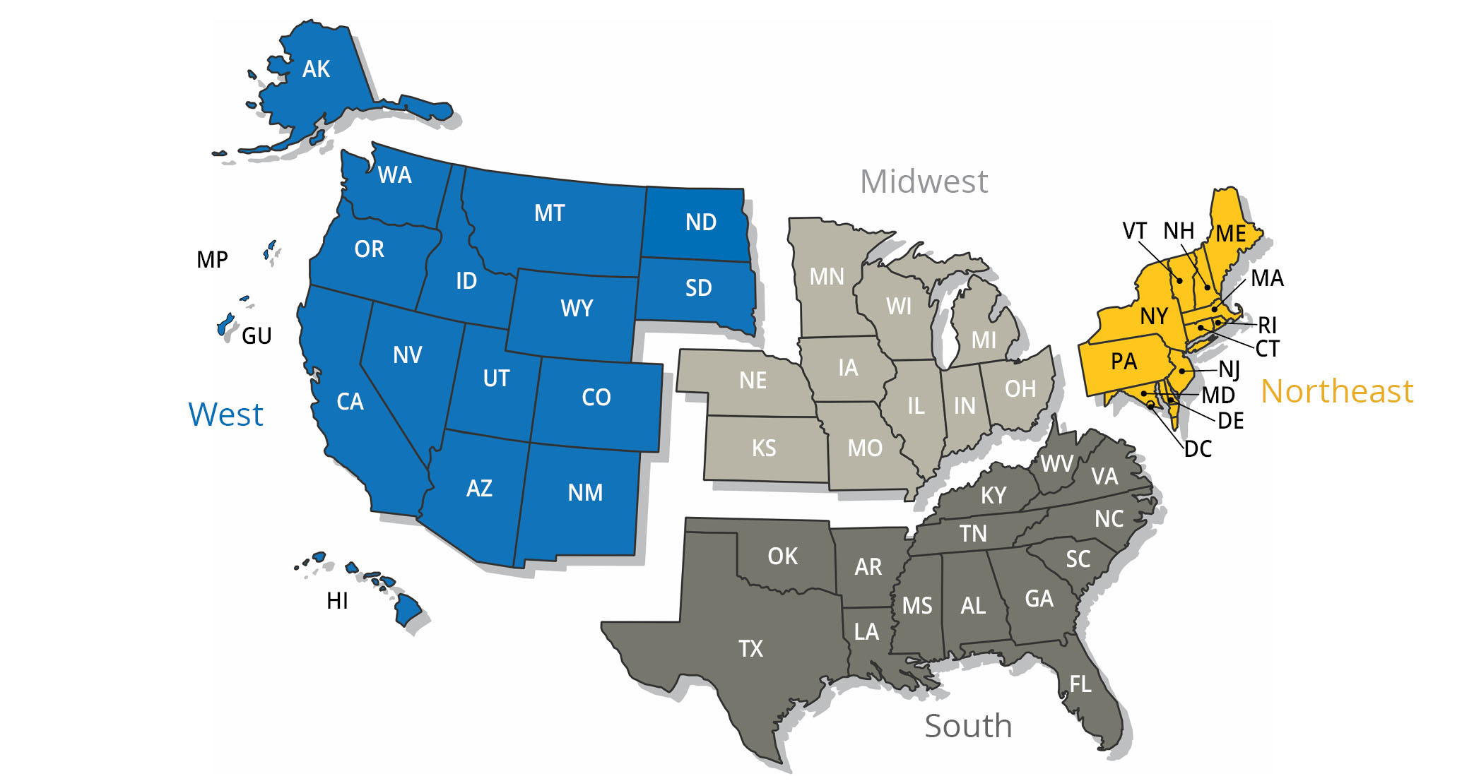 WICHE produces separate projections for four main regions as defined by the U.S. Census Bureau, and also for slightly modified Western and Midwestern regions to account for North Dakota and South Dakota being member states to both the Western Interstate Commission for Higher Education (WICHE) and the Midwestern Higher Education Compact (MHEC). In the charts here, the regions are defined based on North Dakota and South Dakota in the Western region (see Figure 2a).[8]