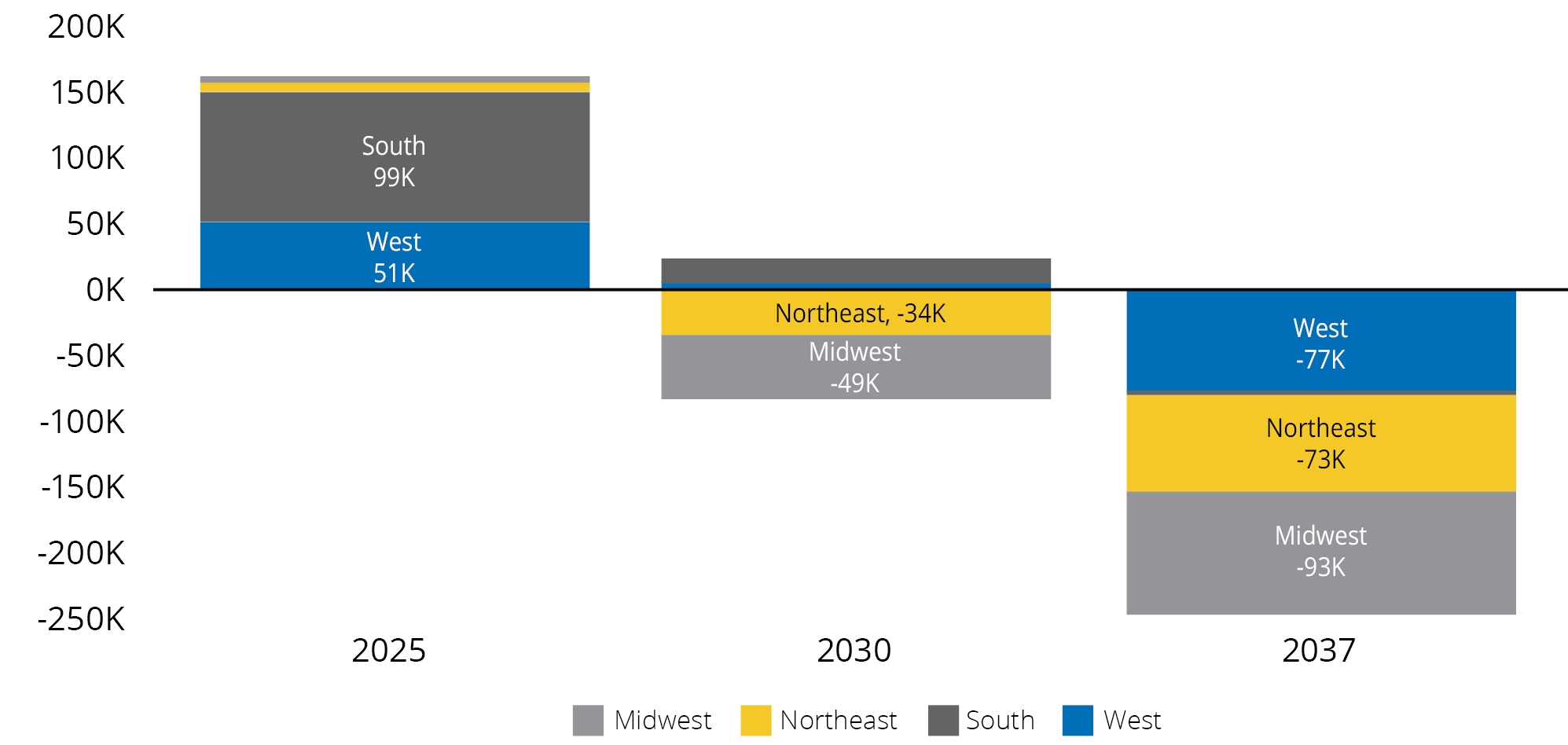 About half of the states in the Northeastern region are projected to have stagnant or declining graduate numbers in most or all years that are projected. Pennsylvania, New York, and New Jersey are projected to hold steady or have slight increases in the number of graduates, until the birth declines take effect in the mid-2020s, after which the regional downturns sharpen.