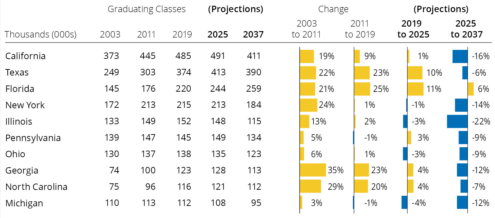 Source: Western Interstate Commission for Higher Education, Knocking at the College Door, 10th edition, 2020. See Technical Appendix for detailed sources of data through the Class of 2019; WICHE projections, Class of 2020 through 2037. (View states or regions)