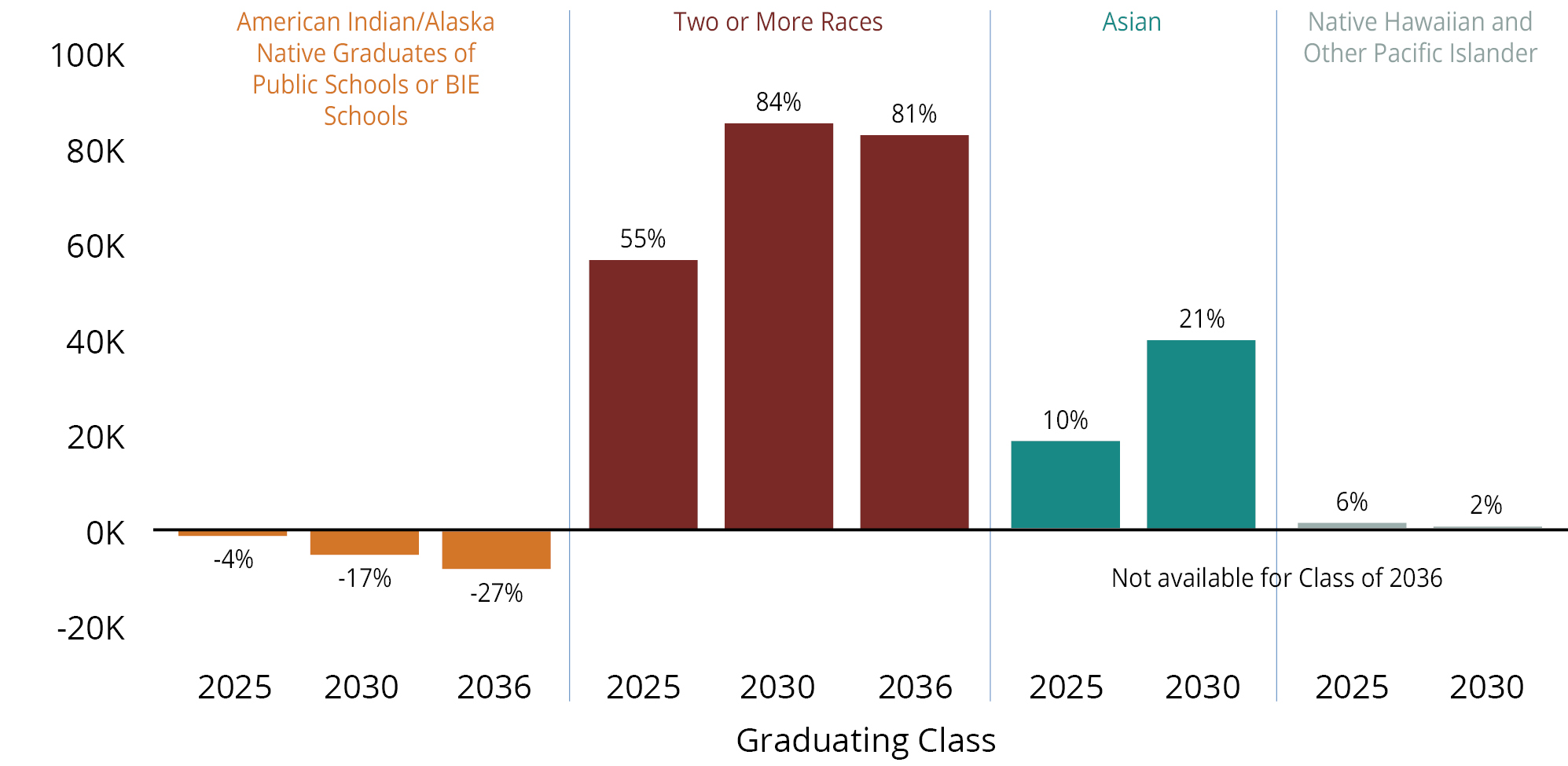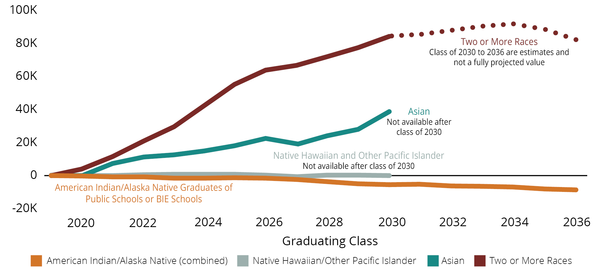 Source: Western Interstate Commission for Higher Education, Knocking at the College Door, 10th edition, 2020. WICHE projections and analysis. Notes: Showing American Indian/Alaska Native non-Hispanic from Public Schools and Bureau of Indian Education Schools (combined), Asian and Native Hawaiian/Other Pacific Islander non-Hispanic separately (through Class of 2030), and Two or More Races non-Hispanic (projected through Class of 2030, then estimated through Class of 2036).