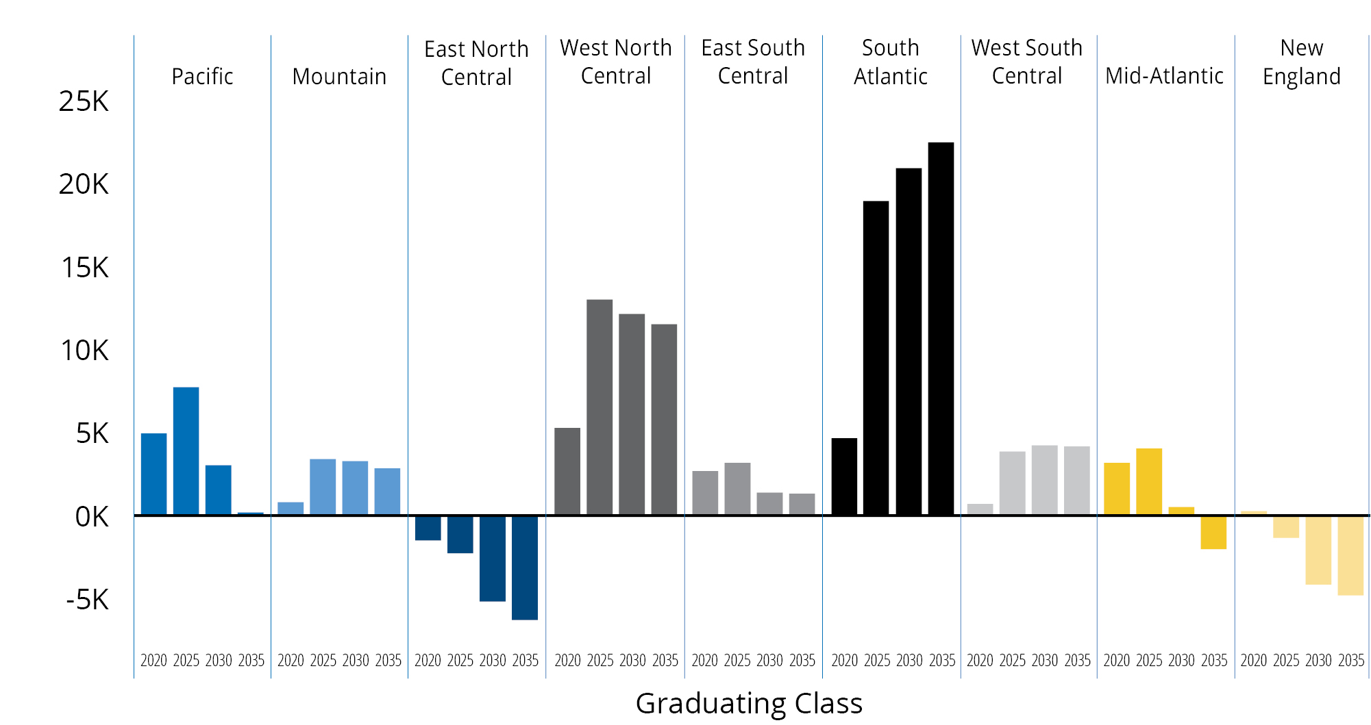 Source: Western Interstate Commission for Higher Education, Knocking at the College Door, 10th edition, 2020. WICHE projections and analysis; see Technical Appendix for details about the private school data source. See endnote 8 for information about U.S. Census regions and divisions.